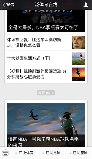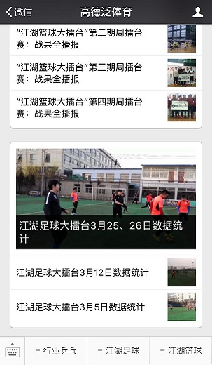 微信公众号 “泛体育在线”微信订阅号每日推送丰富图文消息,提供业余体育赛事和活动信息,体现体育爱好者视点,让用户及时接收和查询最全面的大众体育资讯。 “体育大擂台”微信服务号全面服务于草根体育赛事,权威发布赛事相关的资讯、赛程、战报、数据、图片、视频等内容,构建赛事运营的线上交互平台,让用户随时随地了解赛事最新动态。 微信公众号二维码